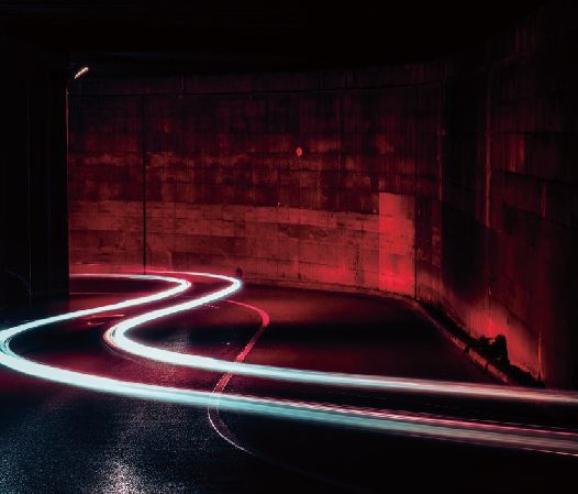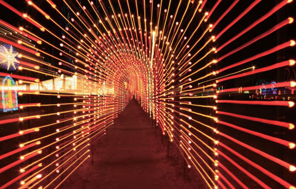 利用慢门 + 变焦的方法可以将原本是静态的城市灯光拍摄为光轨效果。方法也比较简单,只需要在曝光过程中匀速拧动变焦环就可以了。在拍摄时要重点注意快门速度与旋转变焦环的速度应协调、统一。例如,在 3s 的曝光时间内,要从 24mm 端旋转至 70mm 端,应提前进行简单的测试,保证旋转变焦环的过程是匀速的,这样可以最大限度地保证画面中的线条不会出现断裂。另外,拍摄时所使用的快门速度和变焦速度对画面起决定性作用。如果快门速度过高,而转动变焦环的速度慢,则可能出现还没有完成变焦操作,曝光就已经完成的情况,此时画面中的线条比较短;而如果快门速度低,转动变焦环的速度快,则可能出现在完成变焦操作后,曝光还未完成的情况,此时画面中的线条不清晰。因此,在拍摄时需要反复调整快门速度与变焦速度,从而使画面的整体亮度、线条长度与清晰度得到平衡。◆光圈:f/10 ◆ 快门速度:2.5s ◆ 感光度:ISO 100 ◆ 曝光模式:手动模式