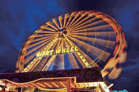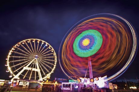 在能够俯视车流的高点进行拍摄,可以充分表现出车流光轨的线条美感。汽车行进的道路最好具有一定的弯曲度,从而可使车流形成的光轨在画面中具有曲 线美。◆焦距:35mm ◆ 光圈:f/13 ◆ 快门速度:2s ◆ 感光 度:ISO 400 ◆ 测光模式:矩阵测光 ◆ 曝光模式:手动模式爬到高楼上向下俯拍车流光轨,曲折的道路可以充分表现其线条美。再利用斜线构图和周围楼宇,令画面既富有动感,又有很强的空间感除了在比较高的位置上以俯视的角度拍摄,使灯光在画面中形成或直或曲的光轨外,还可以尝试仰拍光轨,从而营造画面视觉冲击力。由于双层巴士的光轨本身就有上下两段,再利用仰拍视角,可以使光轨更具立体感。在拍摄时可以将相机放在地面,并在镜头下面垫一些能够让镜头朝上的辅助物,既起到稳定相机的作用,又实现了超低角度仰拍。◆焦距:28mm ◆ 光圈:f/16 ◆ 快门速度:10s ◆ 感光度:ISO 100 ◆ 曝光补偿:-0.7 EV ◆ 测光模式:矩阵 测光 ◆ 曝光模式:快门优先使用广角镜头配合慢门拍摄巴士立体的光轨,形成了一幅空间感和冲击力俱佳的画面选择在天空尚未全黑,还留有夕阳、晚霞的时候开始拍摄。此时街灯刚刚点亮,在长时间曝光拍摄出来的画面背景中,云霞能够让照片更漂亮。在拍摄时,如果天空曝光过度,可以使用中灰渐变镜来压暗天空,平衡天空与地面的光比,缩小明暗反差。◆ 焦距:28mm ◆ 光圈:f/16 ◆ 快门速度:6s ◆ 感光度:ISO 100 ◆ 曝 光补偿:0. 3 EV ◆ 测光模式:矩阵测光 ◆ 曝光模式:快门优先天空的云彩丰富了画面内容, 相比漆黑的天空,画面美感更强由于夜景中的很多灯光都是暖色调,因此拍摄出的照片往往会偏黄。这时就需要注意色温的选择。将白平衡设置为钨丝灯白平衡,或者手动设置自定义色温到3400K~4000K, 可以令画面色彩更自然。◆焦距:18mm ◆ 光圈:f/14 ◆ 快门速度:6s ◆ 感光度:ISO 250 ◆ 曝光补偿:0 EV ◆ 测光模式:矩阵测光 ◆ 曝光模式:快门优先设置正确的白平衡或色温后, 画面的色彩表现更准确,也更耐看在拍摄城市夜景时,游乐场也时常是值得摄影爱好者拍摄的题材。游乐场里的摩天轮、海盗船、旋转木马等游乐设施一到晚上都会有五颜六色的灯光照明, 在夜色的衬托下更显缤纷绚丽。夜晚拍摄游乐设施与拍摄城市夜景一样,适合选择在天色将暗未暗的半个小时内拍摄,此时天空渐变的蓝色能增加照片的层次感,而且蓝色的天空也能衬托出游乐场的灯光颜色,适合拍摄慢门绚丽的效果。拍摄时,建议使用17mm~24mm 焦段的广角镜头 , 这样能够拍出游乐设施的震撼全景。拍摄模式可以选择快门优先模式或全手动模式,游乐设施的运动轨迹相对比较固定,可以先选择较短的曝光时间进行试拍和构图,再尝试不同的曝光时间来选择比较好的光轨效果。◆ 焦距:17mm ◆ 光圈:f/16 ◆ 快门速度:2.5s ◆ 感光度:ISO 400 ◆ 曝光补偿:0.5EV ◆ 测光模式:矩阵测光 ◆ 曝光模式:快门优先使用广角镜头配合慢门拍摄摩天轮的光轨,形成了一幅空间感和冲击力俱佳的画面游乐场内总是熙熙攘攘,人群簇拥,在遇到拍摄背景比较杂乱但又无法避开的情况时,可以考虑使用大光圈来弱化周围的环境,或是利用大光圈拍摄游乐场内丰富的光源,制造浪漫的光斑效果。◆焦距:17mm ◆光圈:f/4 ◆快门速 度:3s ◆ 感光度:ISO 100 ◆ 曝光补偿 :-1.3 EV ◆测光模式:矩阵测光 ◆ 曝光模式:快门优先利用大光圈和慢门可以有效虚化游乐场中的人群,降低其对画面的干扰拍摄游乐场的游乐设施在构图上也是可以遵循常规的构图手法的,比如黄金分割构图法、“井”字形构图法、中心构图法、对称构图法等,但在实际拍摄中也需要根据游乐设施的特点来选用不同的构图和取景方法。例如,使用中心构图可以使整体画面更加突出,因为游乐设施的旋转轨迹大 多数是圆形的,所以拍摄出来的画面基本都是对称的,采用中心构图则比较合适。拍摄旋转中的海盗船时,则可以使用超广角镜头,以斜线构图来突出其运动轨迹的特点。而拍摄摩天轮时,可以运用竖画幅构图,并在摩天轮远处的侧面拍摄其全景;如果在摩天轮下面,则可以拍摄局部,让摩天轮的局部占画面的 2/3 即可。◆焦距:18mm ◆ 光圈:f/16 ◆ 快门速度:5s ◆ 感光度:ISO100 ◆ 测光模式:点测光 ◆ 曝光模式:手动模式